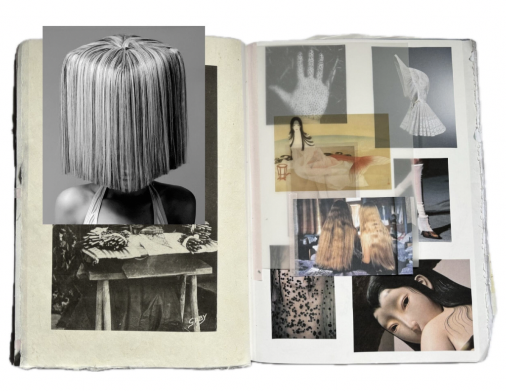 CR: For me, this process always begins with research. I spend hours in the library, browsing books, visiting museums, and studying different artists. That’s how I eventually discovered George Underwood. I found one of her works that I found deeply intriguing, and it became the starting point for my exploration. I usually begin with a key image that captures the essence of what I want to explore, and from there, I expand my research. Once the foundation seems solid, I start sketching in my notebook, where I compile all my research and allow myself to make freer, more intuitive drawings. When a sketch starts to look right on paper, I move into three dimensions. I begin shaping the silhouettes on the mannequin using test fabrics. For more complex shapes, I sometimes construct them on paper first so I can quickly study the proportions and understand the spatial logic before moving to fabric.