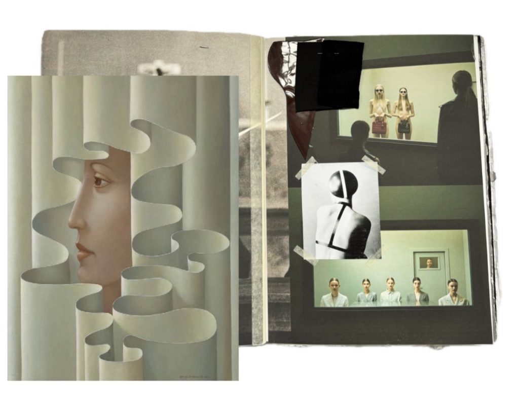 CR: The idea behind “Dot Dot Dot” stemmed from my exploration of the representation of women in Surrealism. I was particularly drawn to how female bodies were often fragmented, objectified, or transformed into something beyond themselves. I found inspiration in the paintings of George Underwood, especially in the way he shows how images and representations can shape our perception of reality. His works often feature faces enveloped in fluid, undulating forms, blurring the line between reality and imagination. This sense of disconnection resonated strongly with my own interest in Surrealist images of women in art and how society constructs idealized images. The figures in these paintings are twisted, elongated, and presented in fantastical and unreal forms. My collection seeks to translate these ideas into fashion through the use of distorted and dreamlike shapes, questioning fixed notions of beauty and identity. Each piece is based on the notion of fragmentation and transformation, encouraging the viewer to reflect on how images, both in art and society, shape our perception of women.